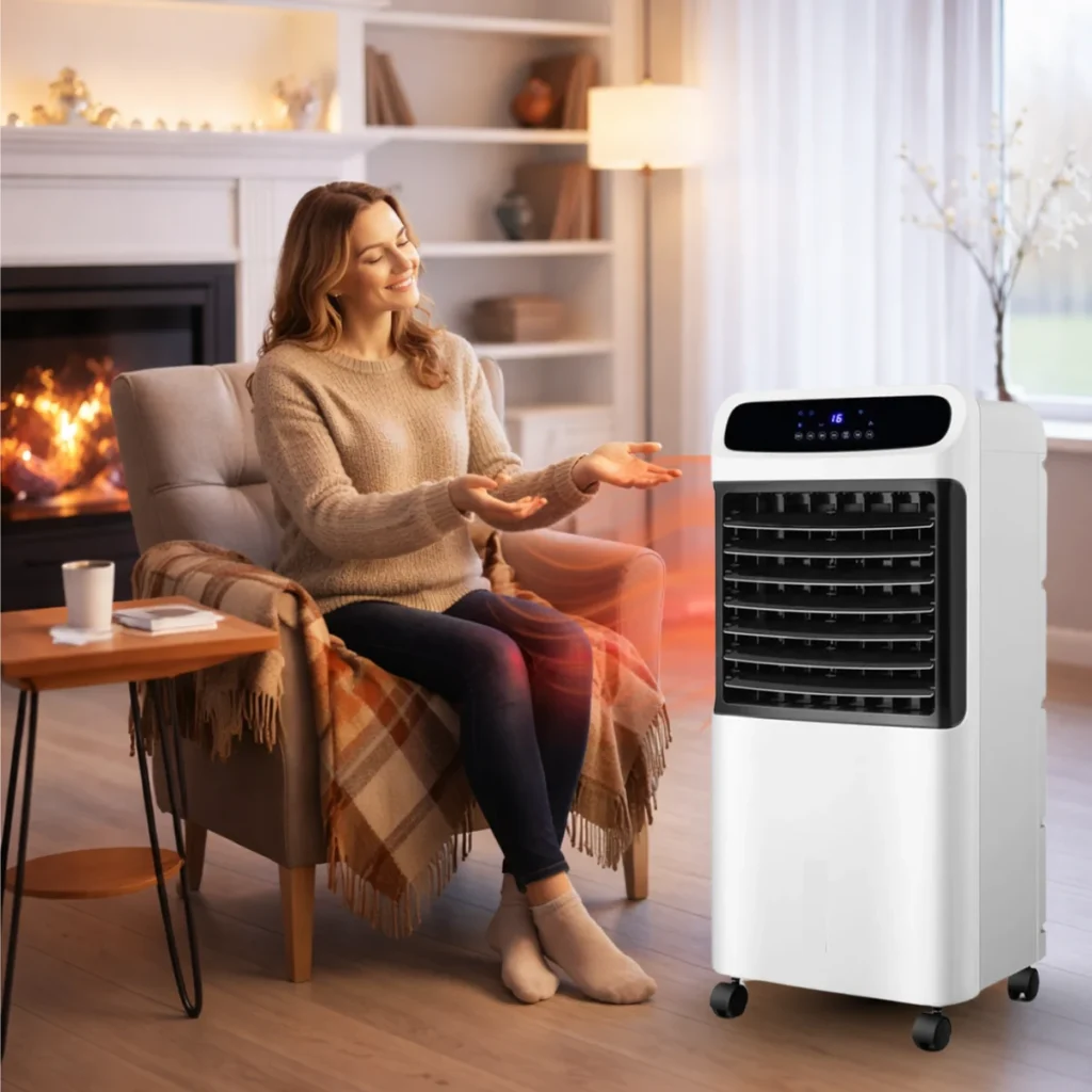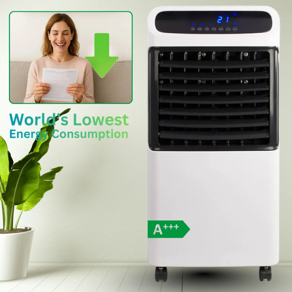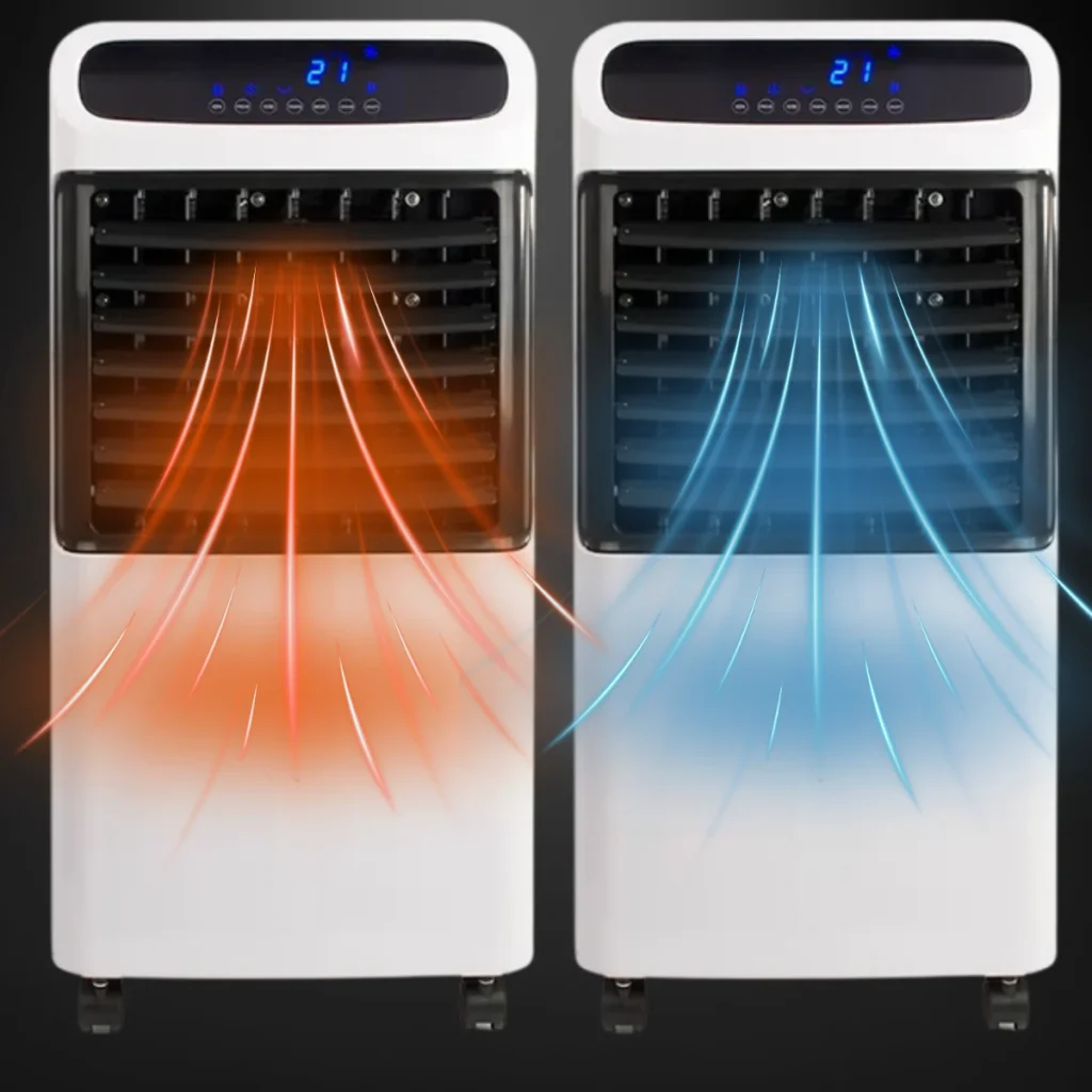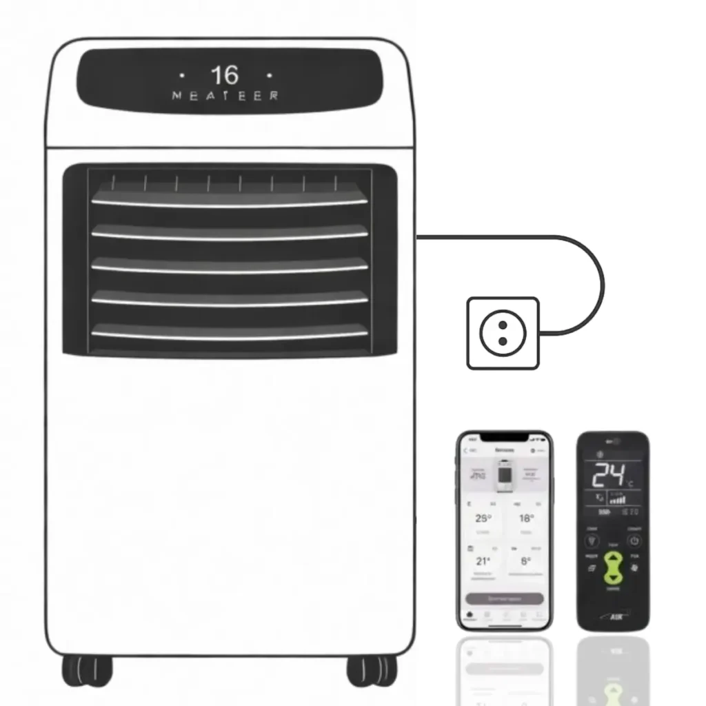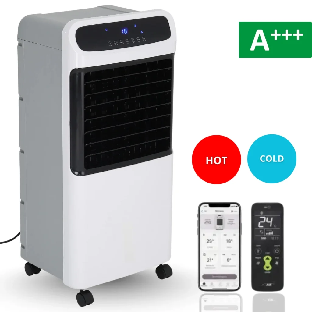 w pełni elektryczny klimatyzator 4 w 1, który chłodzi, ogrzewa, osusza i oczyszcza powietrze. Wystarczy podłączyć go do gniazdka elektrycznego i ustawić preferowaną temperaturę.